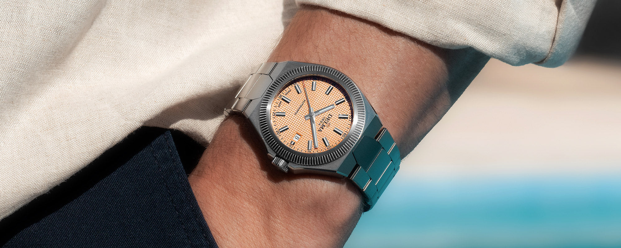 The 2024 Midland is based on a model bearing the same name from the 1980’s with a twist. The overall composition recalls the decade’s bold geometric forms with a new integrated bracelet that blends seamlessly with the tonneau shaped case. The addition of the fluted bezel adds a classic edge and contrast to the smooth brushed elements. The salmon dial is enhanced with a pyramid guilloche pattern. Appointed with applied baton indexes and hour and minute hands with Super-LumiNova BGW9, timing is always legible at a glance.