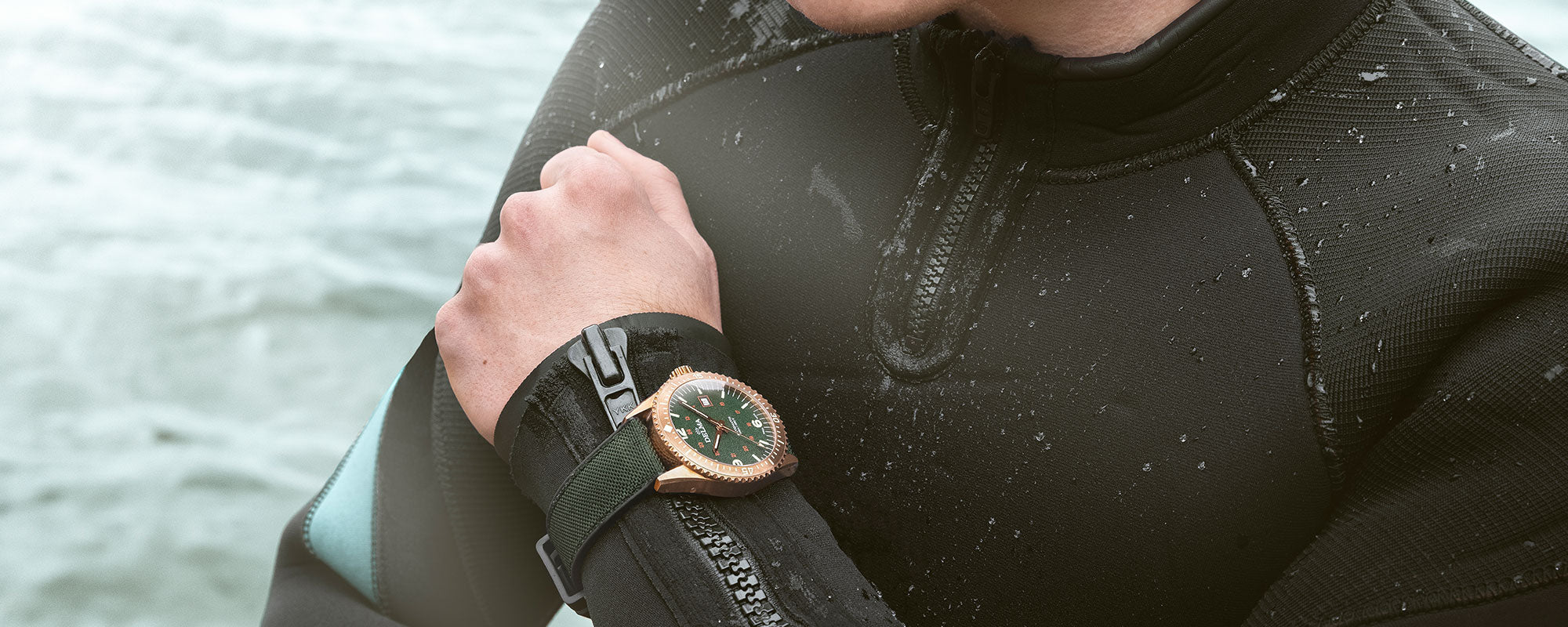 The bronze edition is crafted from antimagnetic and corrosion resistant CUSN6 superior grade bronze, admired for the unique patina formed as it is exposed to the elements. The blue sand textured dial contributes to the natural finish while large luminescent numerals, indexes and hands in Super-LumiNova C3 provide essential legibility in all conditions. With a unidirectional rotating bezel also appointed with luminous indexes and water resistance to 500 m /1650 ft, the Cayman effortlessly lends itself to deep sea excursions as well as seaside leisure.