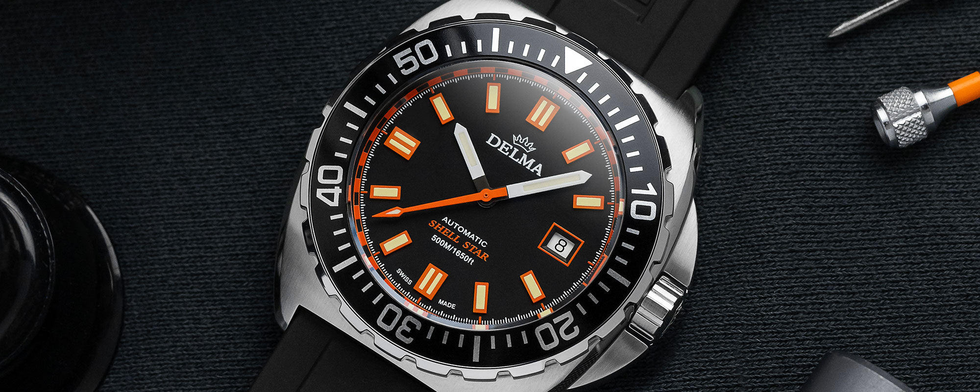 The Shell Star of today is undoubtedly tough. The brushed stainless-steel case boasts a screw down crown for enhanced protection and water-resistance to 200 m / 660 ft. The applied luminous orange indexes and black characteristic unidirectional bezel enable precision in all conditions. The smooth black dial is accented by an orange framed contrasting white date window making it an adaptable classic divers’ watch fit for daily wear but outfitted for professional divers. The quartz movement is sealed within a DELMA engraved case back and the watch is outfitted with a coordinating genuine rubber strap.