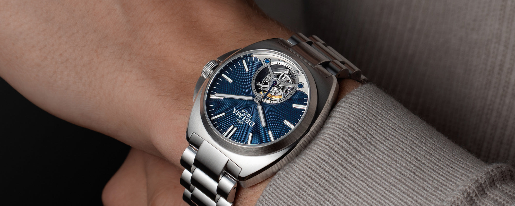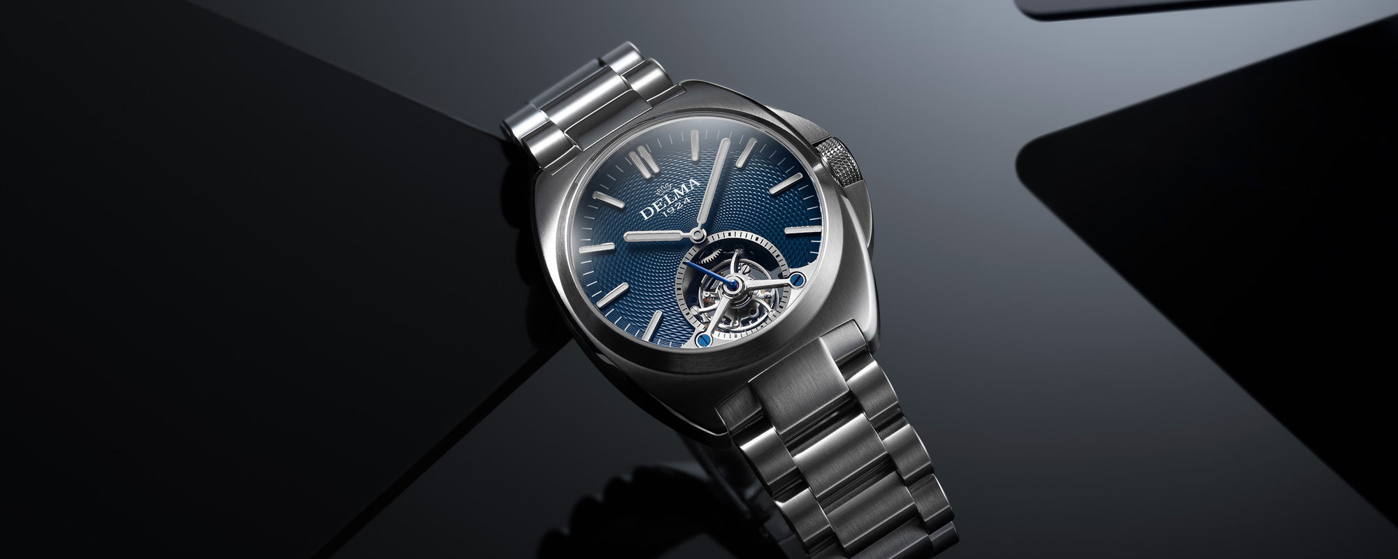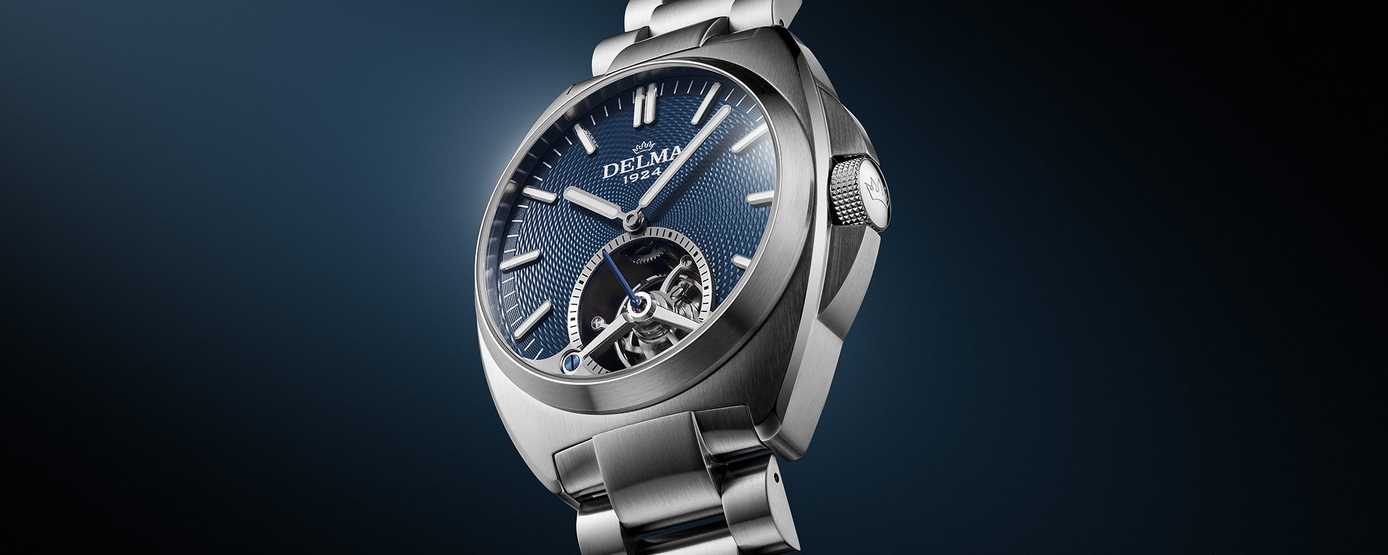 The DELMA 1924 Tourbillon was developed in honor of our 100th anniversary and signifies longevity, craftsmanship and progress. The second edition is a refined evolution of the original sable black version, featuring a signature DELMA blue grains de riz guilloché pattern dial. Rich in intricate details, the new dial frames and enhances the captivating tourbillon – the heart of DELMA’s proprietary 100% Swiss-made, hand-wound movement, offering an impressive power reserve of 105 hours.