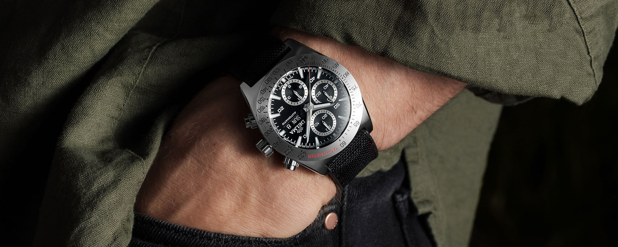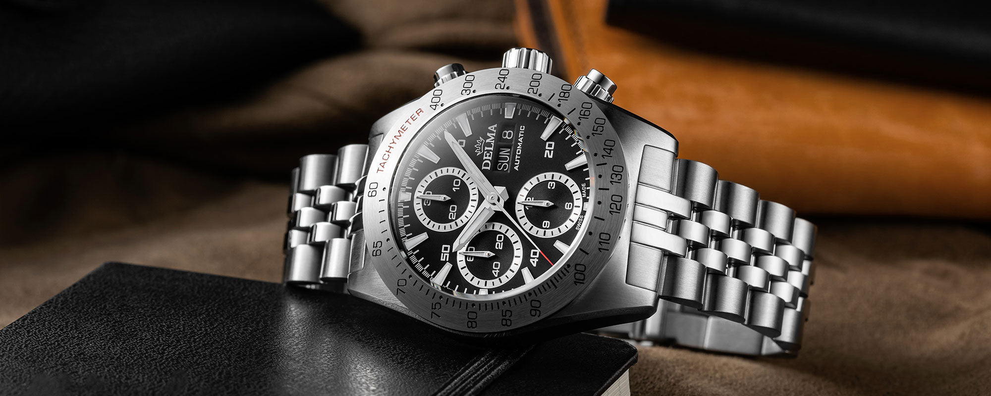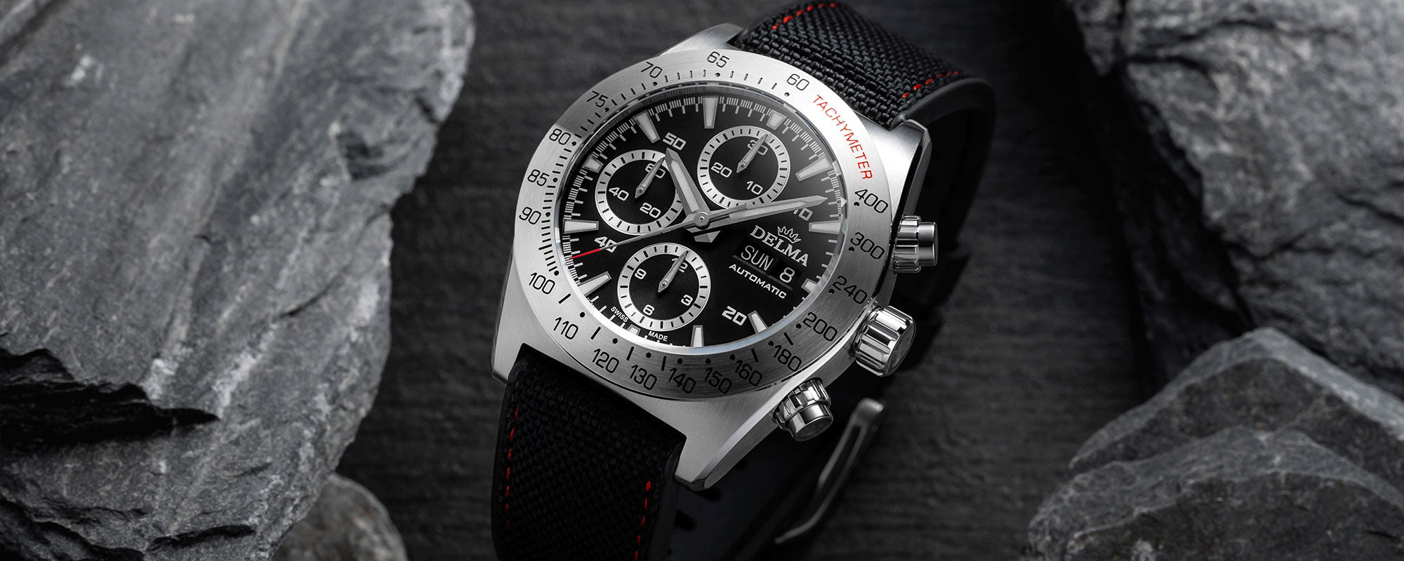 The 42 mm case is a mere 16.2 mm thick but spares no details in functionality or design. The motor sport inspiration is evident from the white sunray brushed dial and guilloche pattern sub dials, ready to perform on circuits or rallies in all terrain. Bold hour, minute hands and a red seconds hand are accompanied by a day-date window crowned with the DELMA logo.