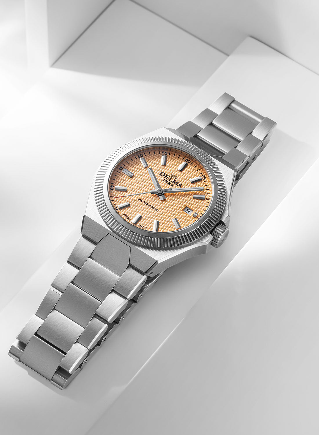 The stainless-steel case is sealed with an DELMA engraved case back is water-resistant to 10 atm. Complete with a folding clasp with pushers, the latest DELMA Midland continues the collection’s pledge to functionality and style that is enjoyable to wear and made to prevail.