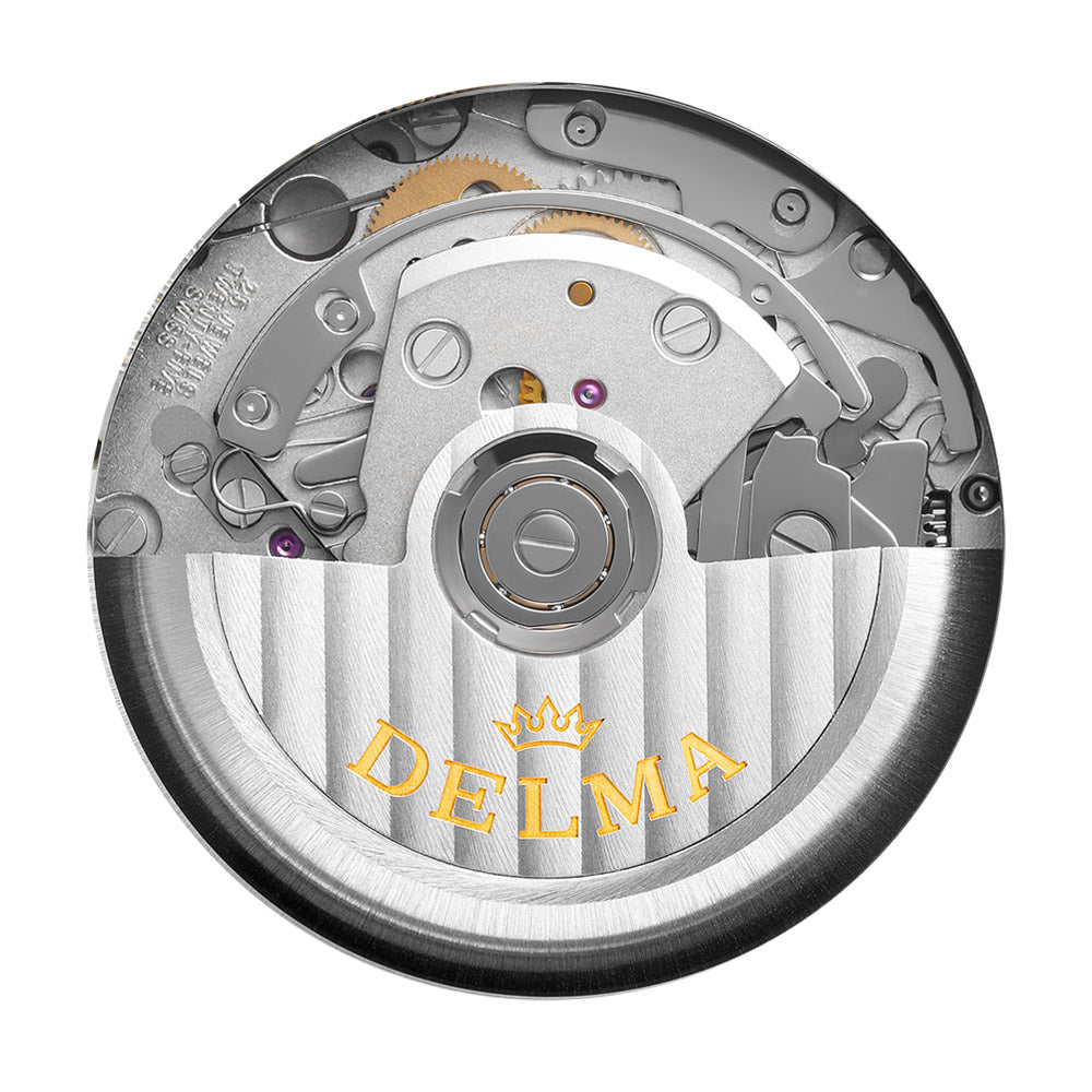 The 42 mm case is a mere 16.2 mm thick but spares no details in functionality or design. The motor sport inspiration is evident from the green sunray brushed dial and guilloche pattern sub dials, ready to perform on circuits or rallies in all terrain. Bold hour, minute hands and a red seconds hand are accompanied by a day-date window crowned with the DELMA logo.