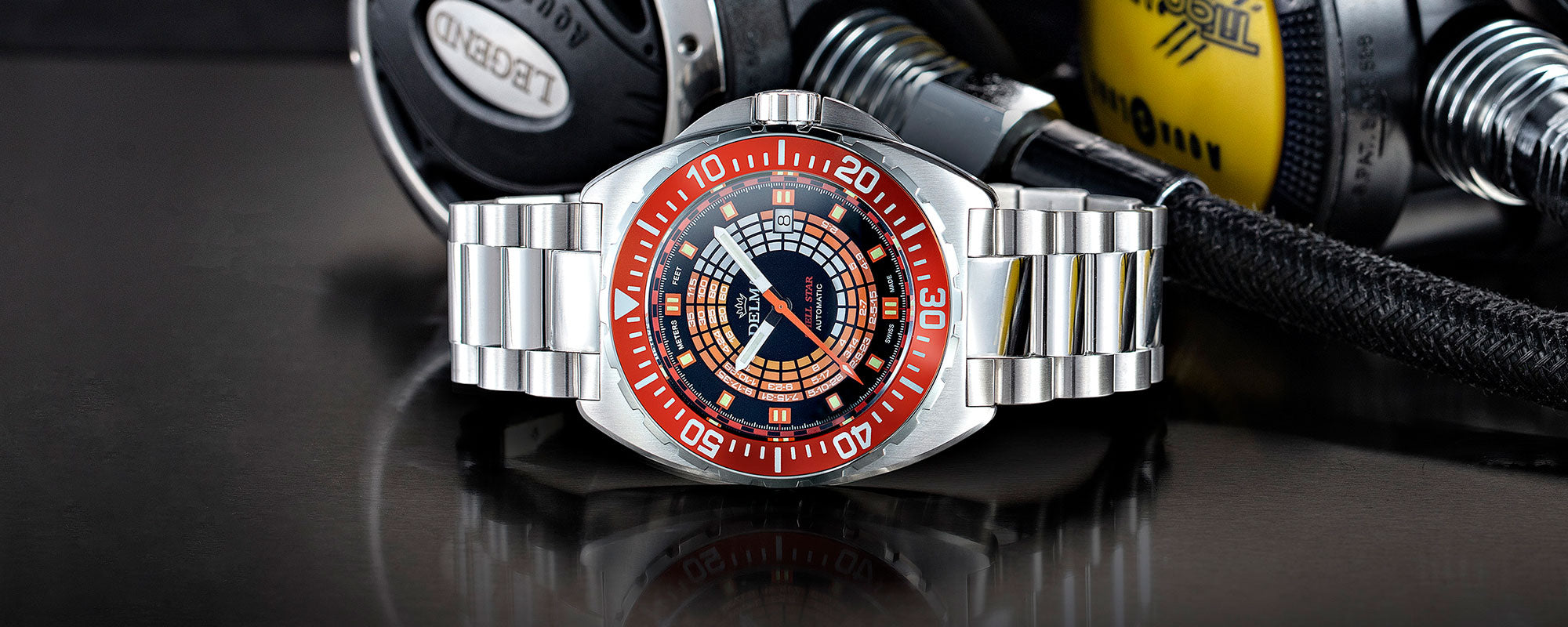 With sophisticated diving technology built upon the design of DELMA’s cherished Shell Star collection, the Shell Star Decompression Timer presents a rarely seen feature in a timepiece that is equally technical, durable and stylish. Key historical characteristics include a spade central seconds hand, the railway track and orange and white indexes.