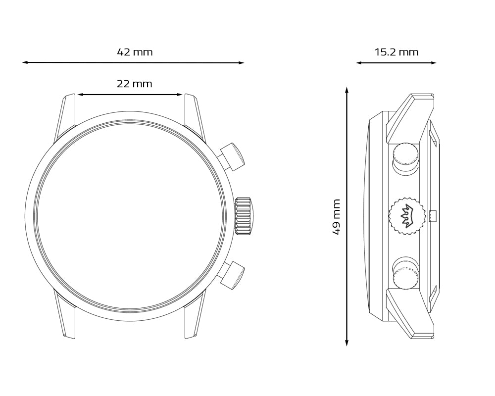The elegant black sunray brushed dial is complimented by its guilloche bi-compax counters. The applied indexes and hour markers, date window at 6 o'clock, and red central seconds hand refine the timeless look. The quintessential crown and pushers and brushed and genuine leather strap resonate with the nostalgic style to complete the lightweight, comfortable and effortlessly luxurious design. The automatic movement with DELMA engraved côtes de Genève striped finish rotor can be observed through the transparent case back.