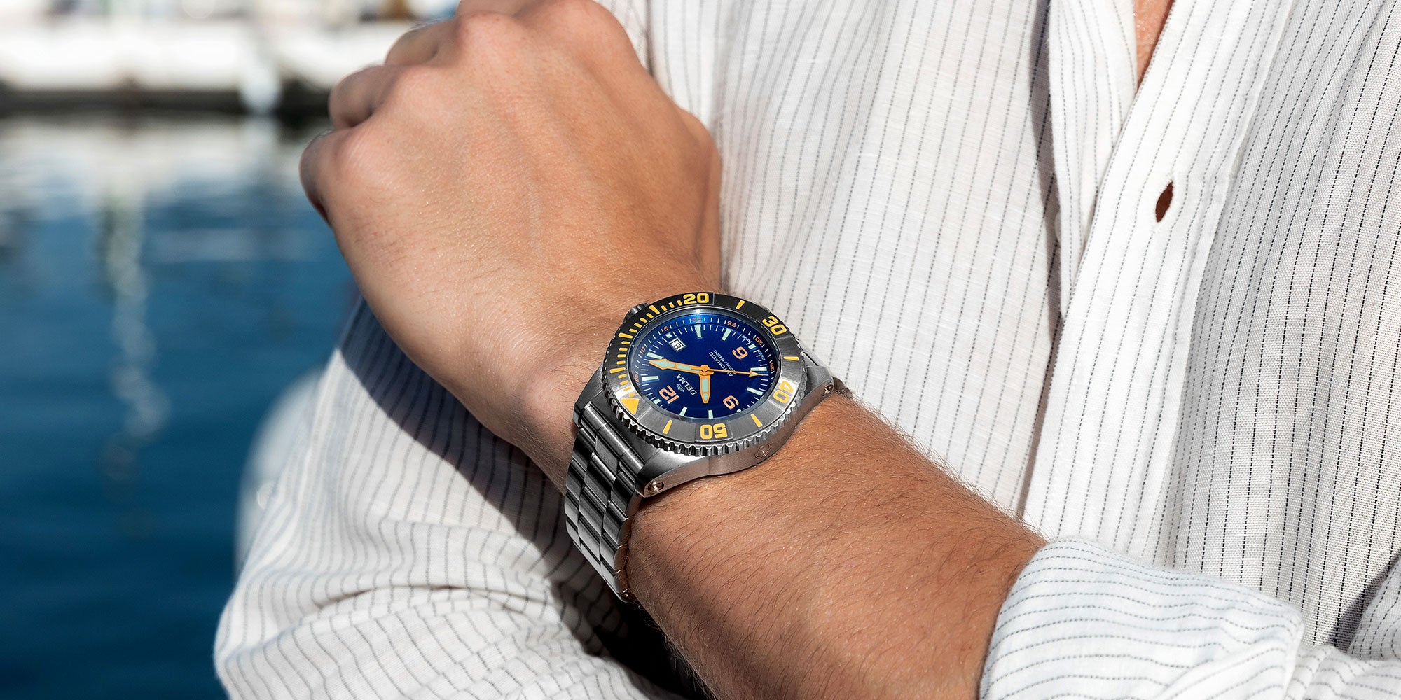 The Blue Shark IV transcends its superb predecessors with an unimaginable water resistance to 5000 meters. This impeccable divers’ watch incites curiosity and exudes strength. As the fourth iteration of DELMA’s renowned deep-sea diver, it embraces the coveted Blue Shark design while integrating elevated durability and subtle enhancements.
