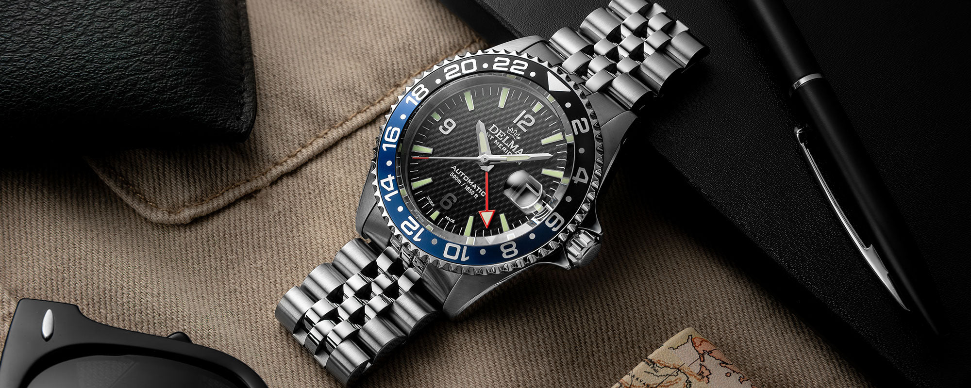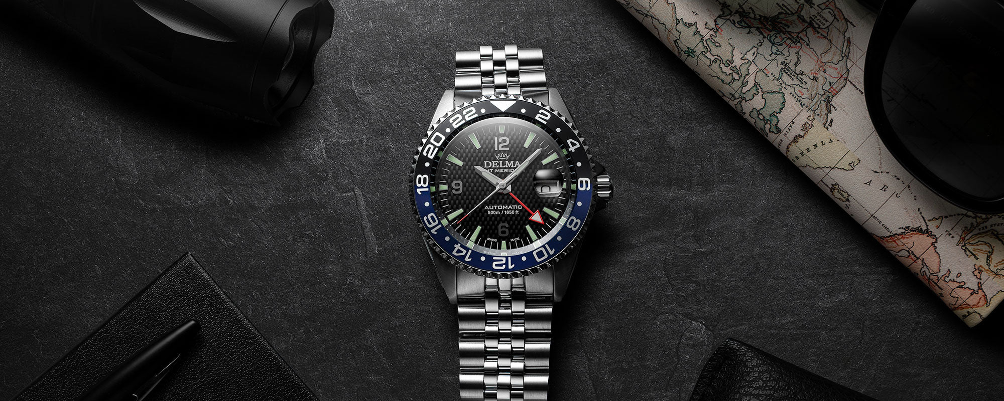 With a distinctive 43 mm diameter case, water resistance to 500 m / 1650 ft and a solid five link stainless steel bracelet, the Santiago GMT provides universal enjoyment for globetrotters and visionaries. The automatic movement, engraved with the DELMA logo, is visible through the transparent case back.