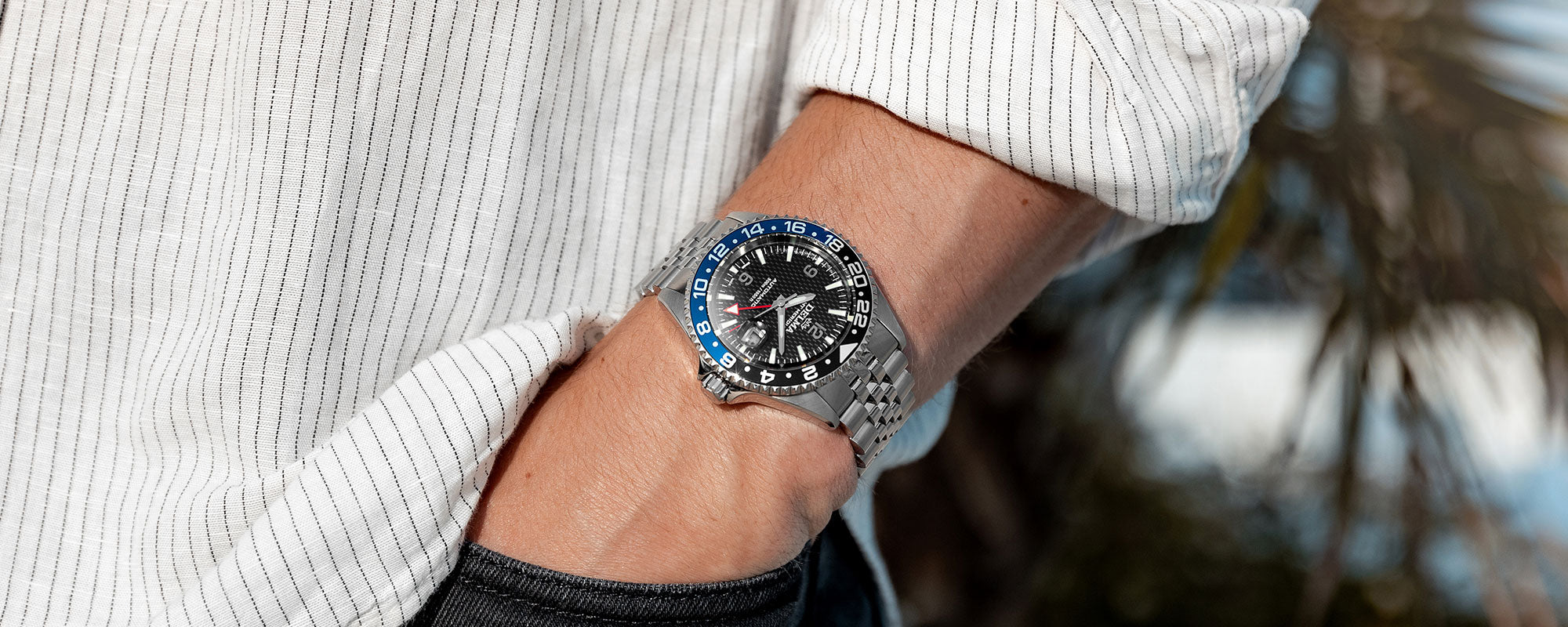 Thanks to its classic looks and indispensable features, the Santiago is practical and stylish for divers at all levels. The savvy GMT model is appointed with luminous Arabic numerals and geometric indexes. The 24-hour unidirectional bezel clearly displays a second time zone in black and green anodized aluminum. The silver hour and minute hands, red tipped seconds, and red GMT hands compliment the green carbon weave pattern dial, and framed date window at 3 o’clock.